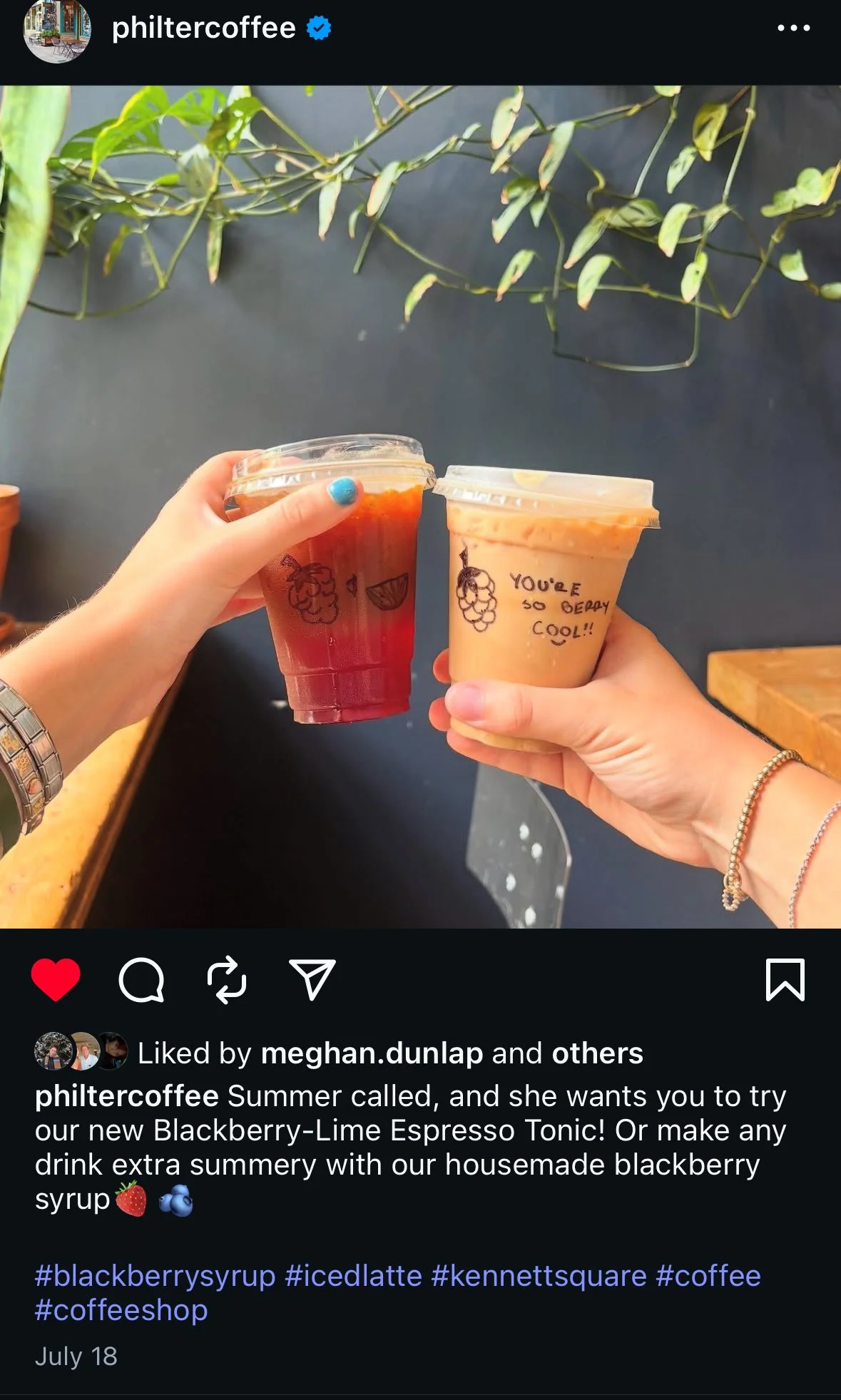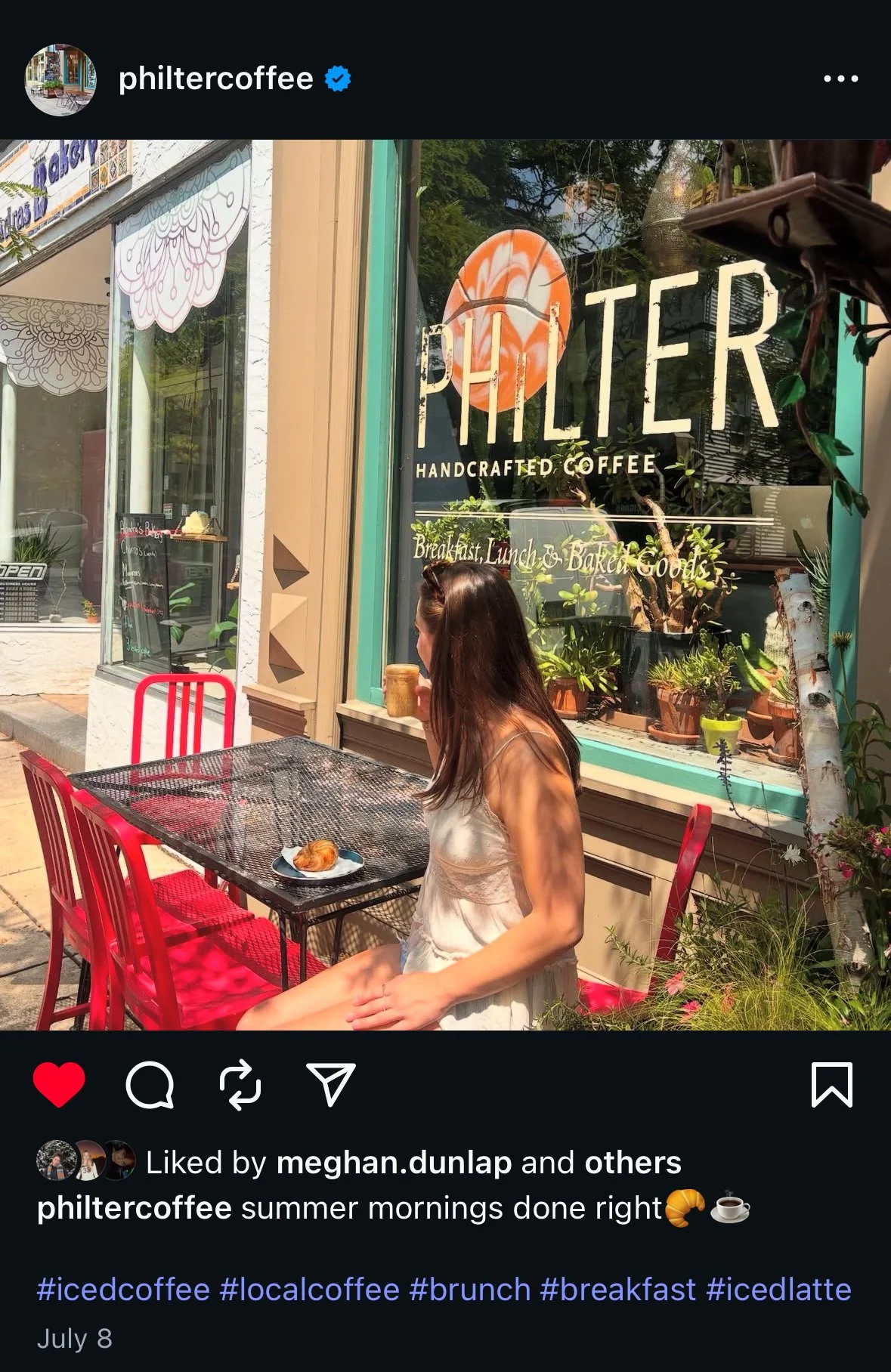 In my time at Philter Coffee, TikTok profile views increased 7,750%, net followers grew by 4,100%, and total views rose by 73.7%. On Instagram, accounts reached increased by 293.8% , profile activity rose by 59.4%, and profile visits grew by 64.9%.